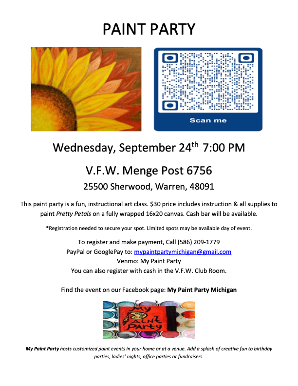 Join us on Wednesday, September 24th at 7:00 PM at VFW Menge Post 6756 for a Paint Party!
