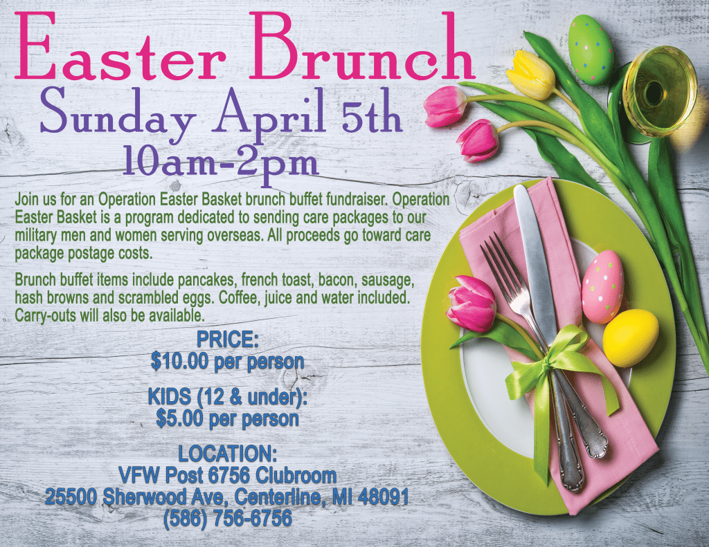Join us on Sunday April 5th, 2026 from 10am-2pm for an Easter Brunch Buffet Fundraiser in the Clubroom. All proceeds from the fundraiser will go toward Operation Easter Basket, sending care packages to our military men and women serving overseas. Price is $10 per person, $5 for kids and includes the buffet, coffee, juice and water.