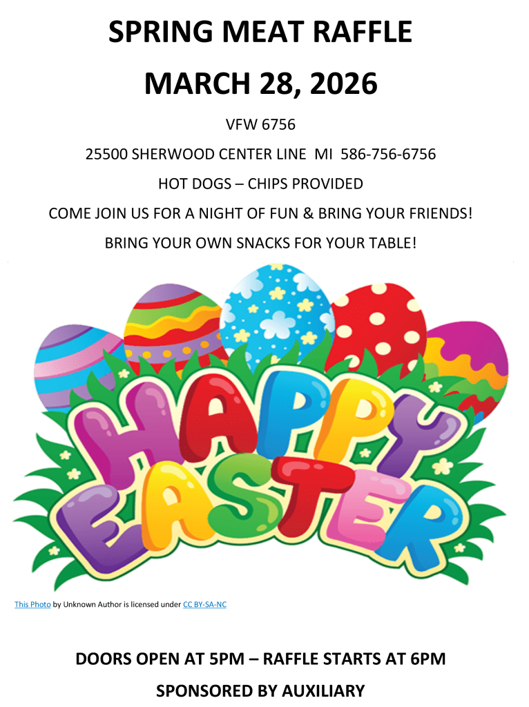 Join us for a night of fun and bring your friends on March 28, 2026 for our Spring Meat Raffle. Hot dogs and chips will be provided but feel free to bring your own snacks for your table.